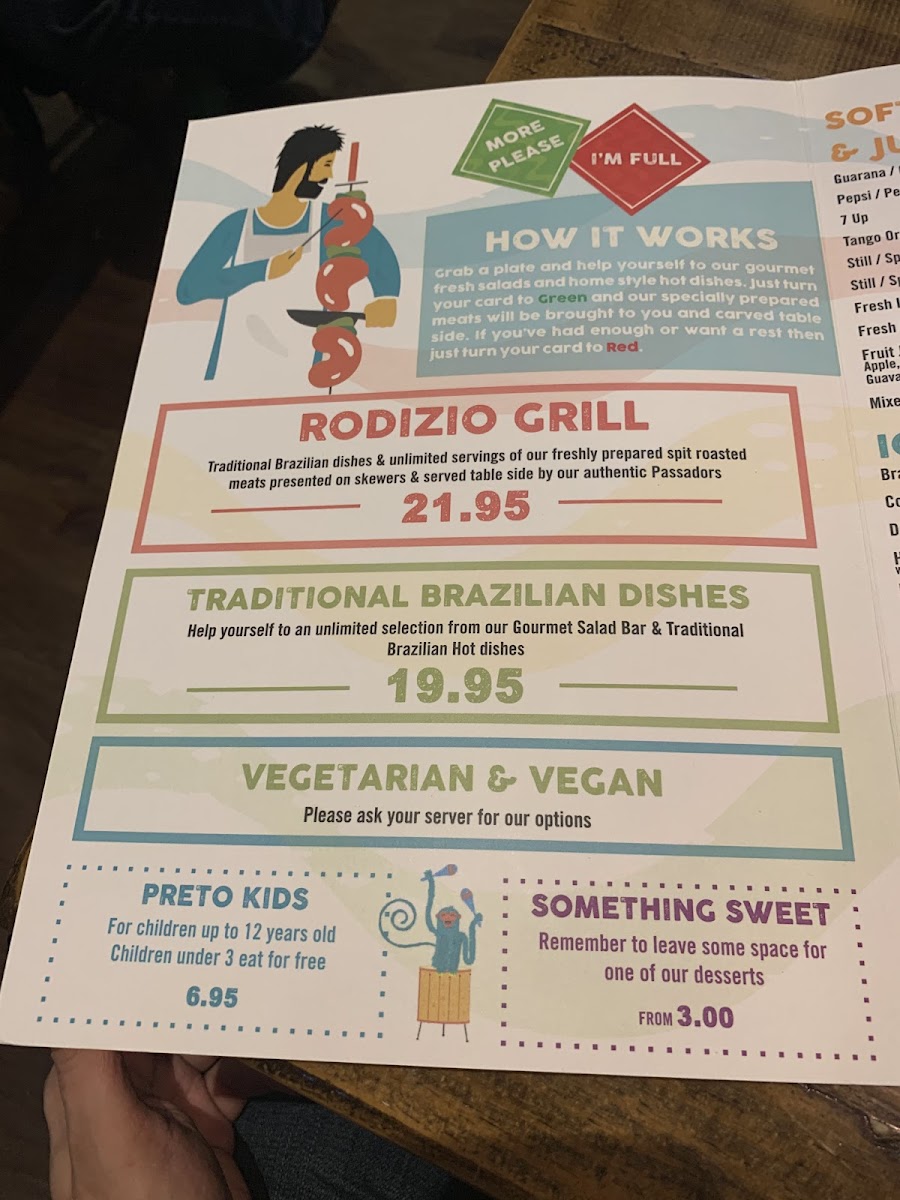 The menu showcases an extensive selection of succulent meats, including various cuts of beef, chicken, pork, and lamb. Diners can indulge in at least 16 different cuts, with the picanha standing out as an absolute must-try. The buffet is equally impressive, offering a range of traditional Brazilian sides—think fresh salads, hearty potatoes, and more.